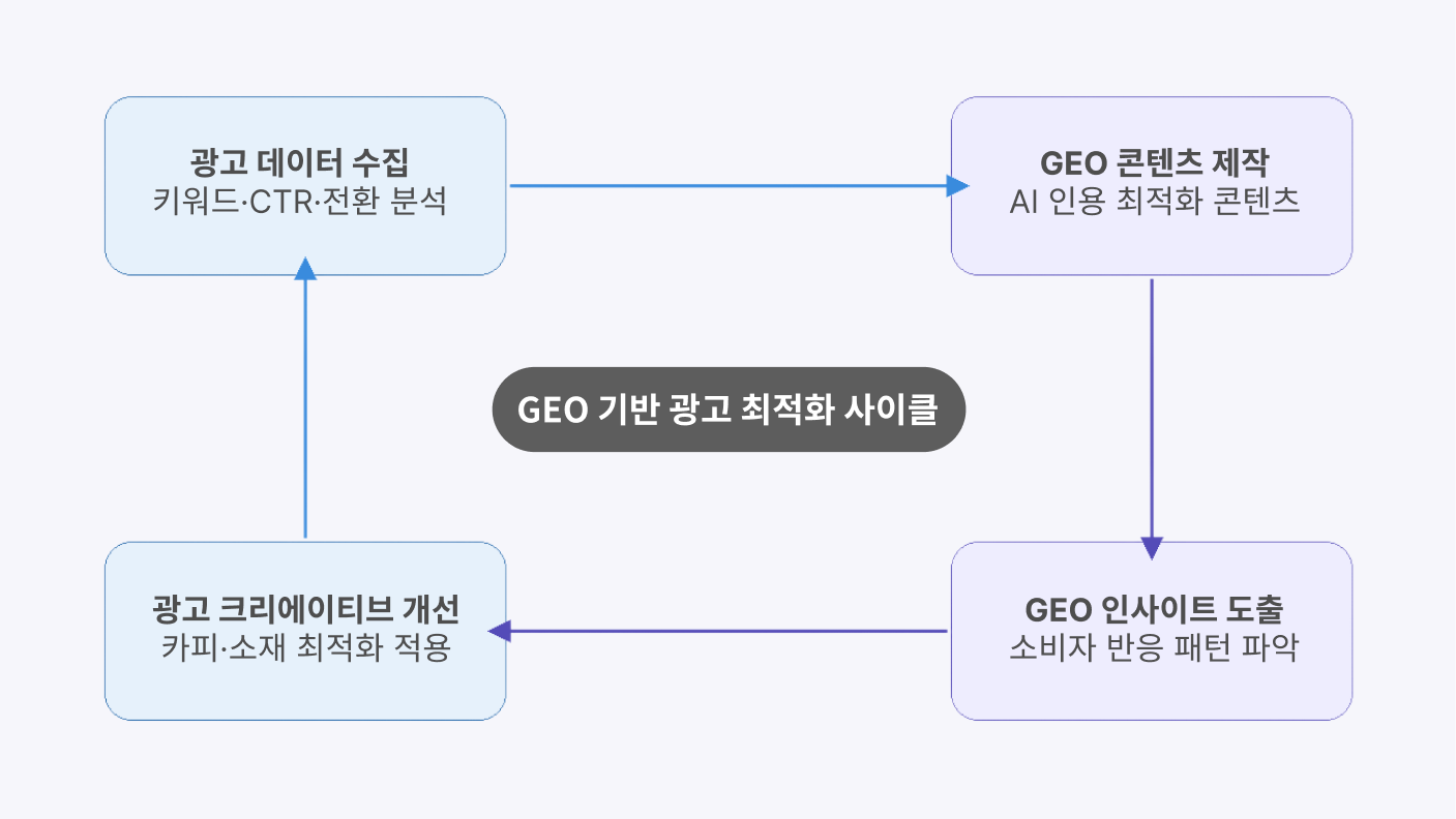 GEO와 광고는 따로 움직이는 게 아니에요. 광고 데이터에서 소비자 언어를 뽑아 GEO 콘텐츠를 만들고, GEO에서 얻은 인사이트를 다시 광고에 반영하는 사이클이 만들어질 때 퍼포먼스가 올라가요. 단방향이 아니라 양방향으로 연결되는 구조가 핵심이에요. 아래에서 이 사이클을 실제로 어떻게 만드는지 구체적으로 다뤄볼게요.