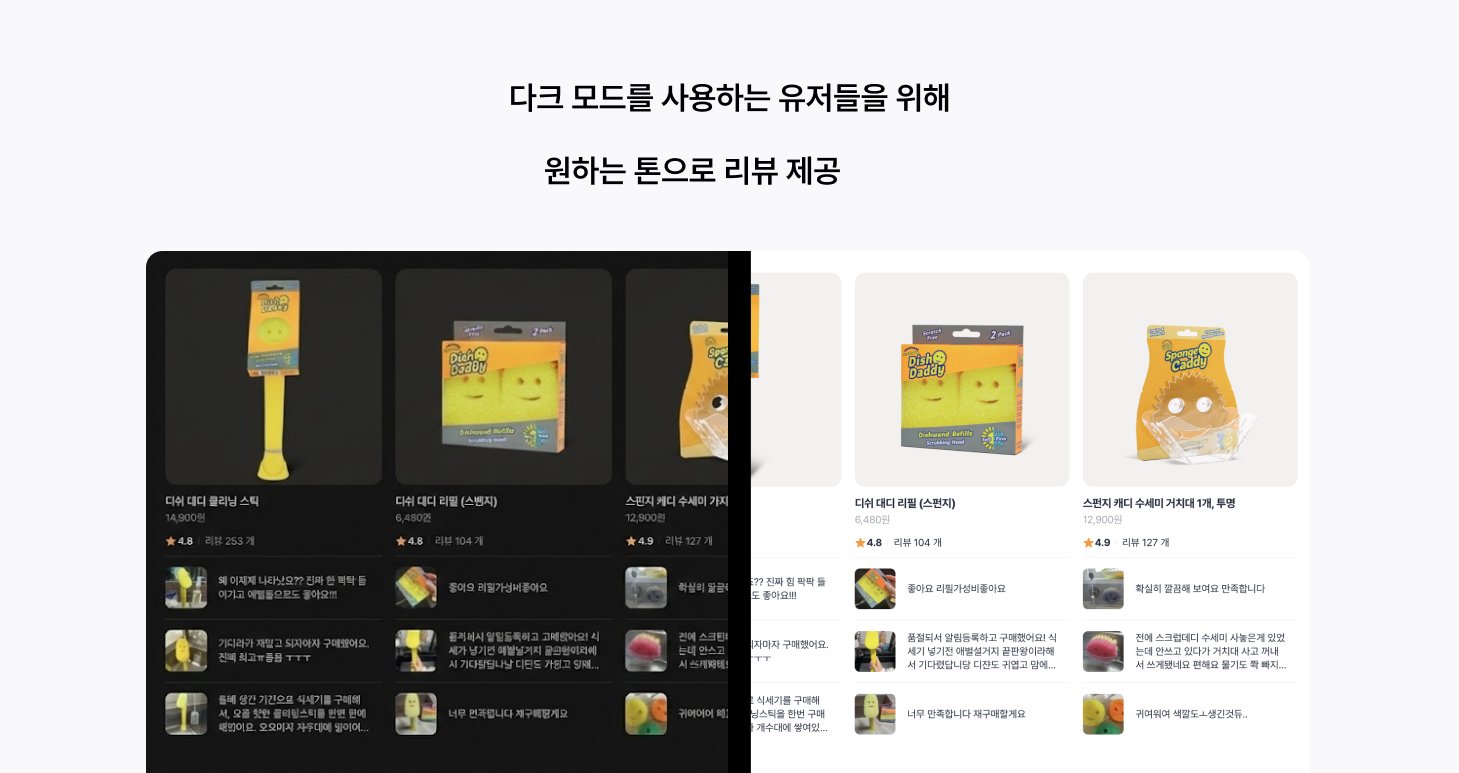 고객 친화적인 UI를 제공할 수 있게 알파리뷰 업데이트는 다크모드도 지원해요. 이제 쇼핑몰에서 원하는 톤으로 완벽하게 대응해 보세요.