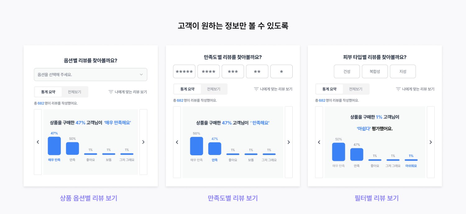 건성/지성 피부 타입, 체형, 키 등 고객의 특성에 딱 맞는 리뷰만 필터링해 보여줘요. 내 타입에 맞는 리뷰만 확인함으로써 고객은 상품이 자신에게 잘 맞을지 빠르게 판단하고 빠르게 구매를 결정할 수 있어요.