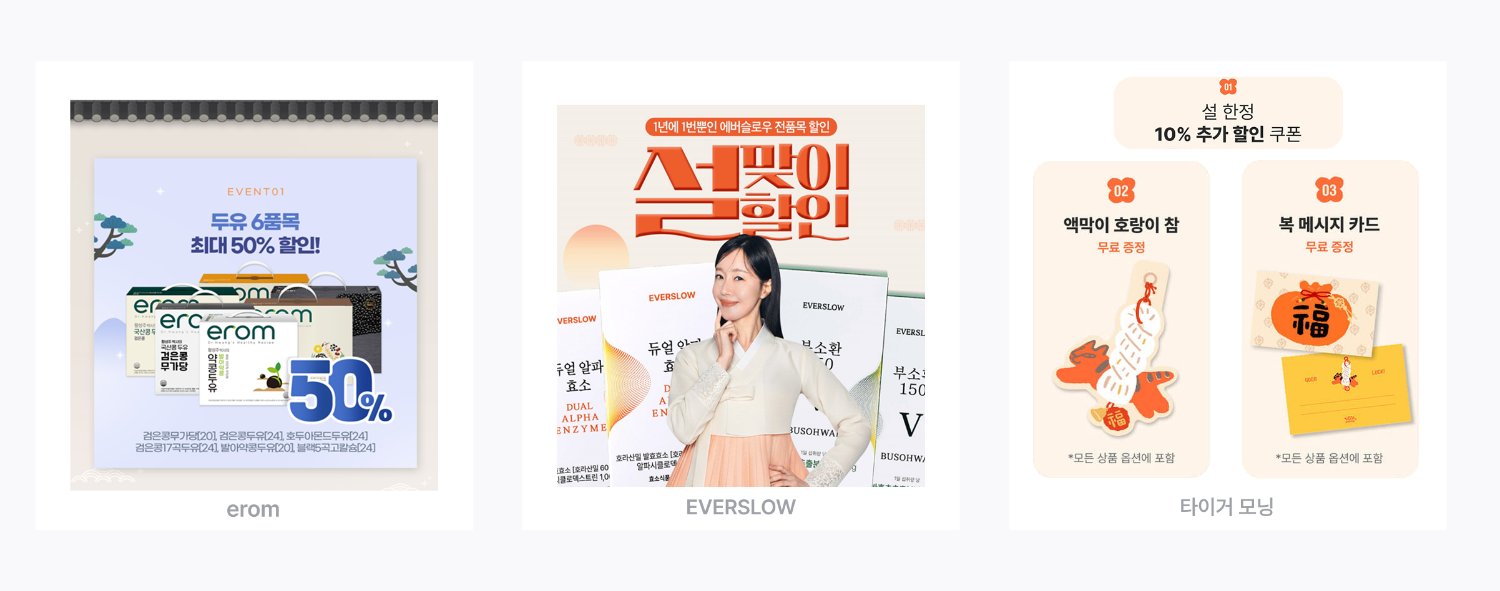 실제로 정관장에서는 명절에 걸맞은 포장과 고객이 직접 결정하지 않고 제품 구성까지 큐레이션 되도록 자사몰과 상품을 구성했습니다. 자사몰 진입과 동시에 프로모션을 노출함으로써 고객의 탐색 시간을 획기적으로 단축하고, 망설임 없는 구매 결정을 끌어냈어요.