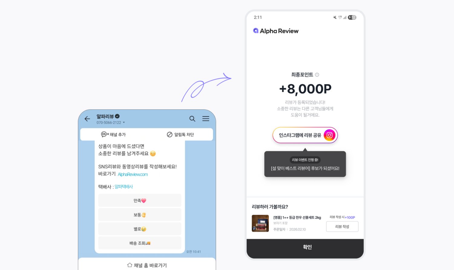명절 선물은 신뢰가 핵심이죠. 또한 리뷰는 자사몰의 핵심 마케팅 수단인데요. 실제 사용자의 사진과 동영상 리뷰는 앞으로의 구매에도 큰 영향을 끼치기 때문이죠. 특히 리뷰는 검색과 SNS 확산에서도 중요하답니다. 자사몰 구매가 증가하는 명절 기간 동안 현금성 보상을 통해 리뷰 작성 동기를 강화해 보세요.