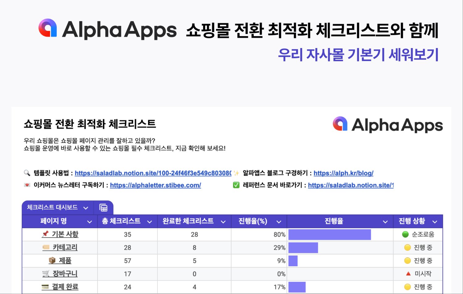화려한 명절 프로모션보다는 결국 흔들리지 않는 자사몰의 시스템이에요. 명절로 고객 유입에 성공했다면 앞으로 자사몰 운영에 필요한 핵심 기능을 알파앱스와 함께 해보세요. 아래 체크리스트를 확인하고 우리 브랜드의 단단한 기본기를 다져보세요!
