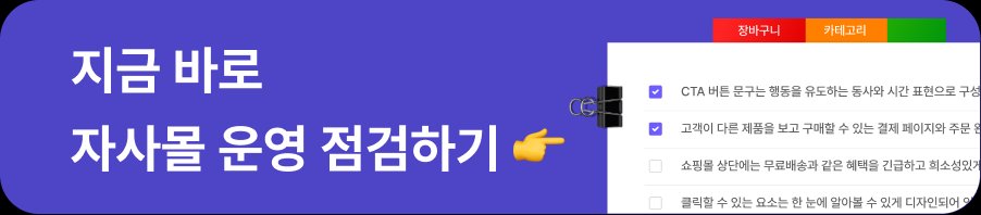 단순히 할인으로 유도해 일회성 구매자로 남겨두는 것이 아닌, 자사몰에 안착시키기 위한 리텐션 전략도 필요해요. “지금 가입 시 사용 가능 포인트 즉시 적립”, “명절 기간 회원가입 시 무료 배송”, “구매 시 포인트 적립”과 같은 실질적인 리워드 전략을 프로모션에 녹여보세요. 이번 설날의 구매가 단발성 이벤트에 그치지 않고 우리 브랜드를 다시 찾게 만드는 강력한 동기가 될 거예요. CTA 문구가 고민이라면 아래 체크리스트에서 챙겨가세요!