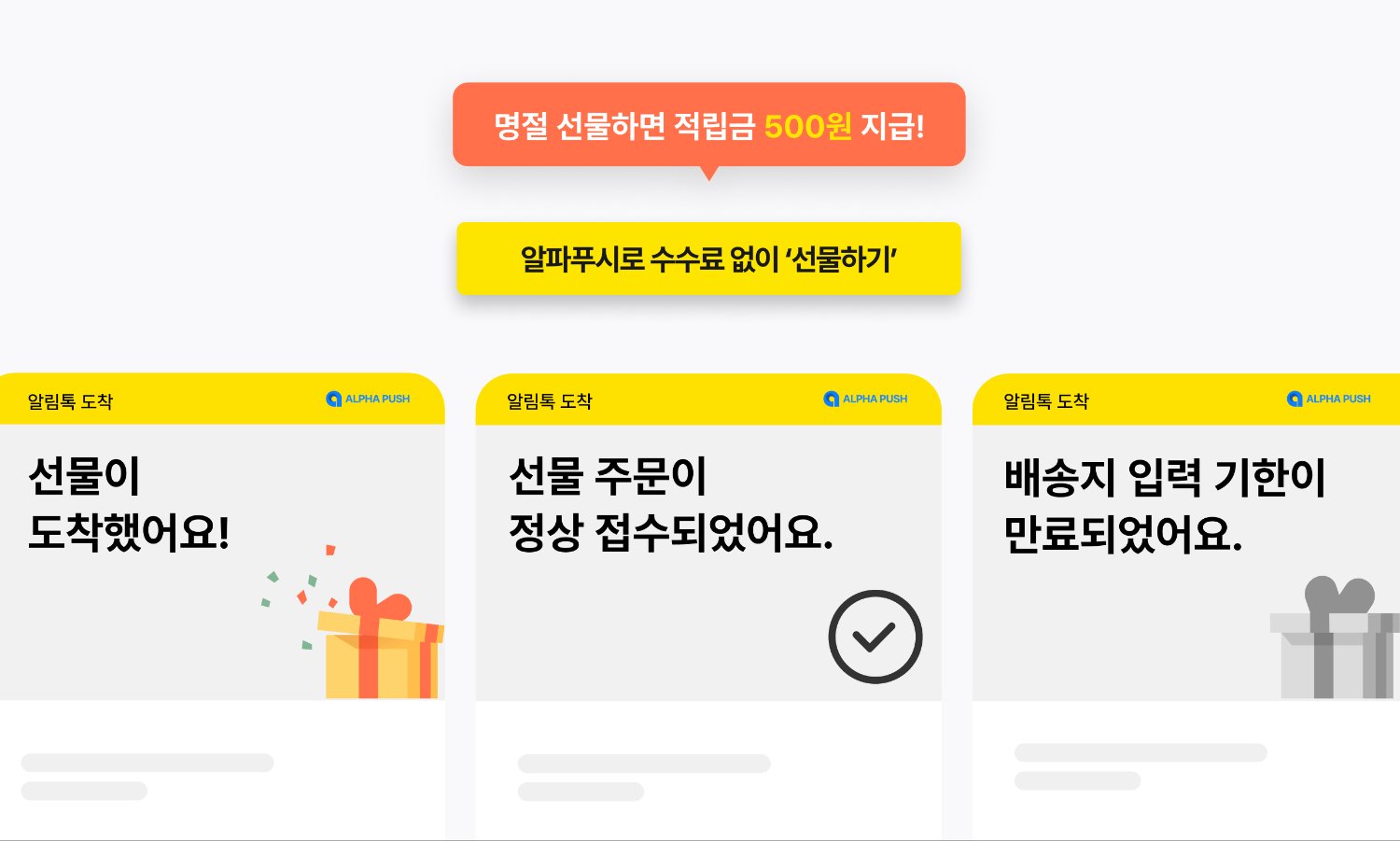 그럼에도 명절에는 ‘배송 이슈’와 포장 상태로 인해 조바심이 커지기 마련이죠. 그럴 땐 무사히 마음은 전달하고 조바심은 덜어 놓는 ‘선물하기’ 기능이 핵심 무기가 됩니다. 여러 명에게 한 번에 선물할 수 있는 ‘대량 발송 기능’을 추가하는 것도 좋아요. 단체 주문을 끌어올려 매출을 키우는 핵심 동력이 될 거예요. 더불어 선물을 보내는 이의 마음이 전달되도록 ‘메시지 카드’ 기능을 제공하세요. 단순 메시지 기능을 넘어 브랜드의 세심함을 각인 시키고 긍정적 이미지를 어필할 수 있는 터치 포인트가 되기도 한답니다. 알파푸시 선물하기 기능을 활용하면 수수료 부담 없이 선물하기 배송기능을 활용할 수 있어요.