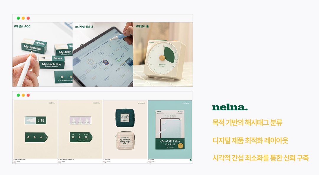 낼나는 사용 목적에 따른 카테고리 설명을 해시태그(#)로 표현했어요. 고객이 원하는 상품을 찾는 데 드는 인지적인 노력은 줄이고 접근성을 높인 건데요. 또한 제품을 격자 형태로 정렬하고 제품 사진 배경을 단색으로 통일한 구성은 디지털 제품 특유의 감도를 높여주는 장치가 됐어요. 특히 브랜드 컬러를 일관되게 적용해 시각적 간섭을 최소화한 형태는 브랜드의 전문성에 대한 신뢰를 높이는 효과를 줍니다. 감성적인 수식어 대신 명확한 레이아웃과 실용적인 분류 체계를 우선시함으로써 소비자의 구매 결정 과정을 효율적으로 만든 거예요.
