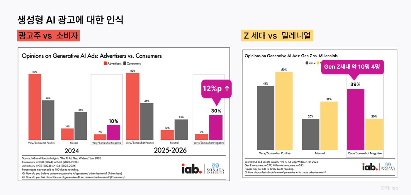 더욱 주목할 만한 점은 소비자들의 AI광고에 대한 인식이 더욱 부정적으로 변하고 있다는 점이에요. IAB 조사에서 2024년에 비해 ‘AI 광고가 싫다’라고 응답한 비율이 18%에서 30%로 12%p나 증가했고, Z세대의 10명 중 4명이 AI 광고가 싫다고 답했어요. 즉, 기업들은 AI 광고를 쓰는 브랜드를 ‘트렌디하다’고 생각하지만 소비자 중에서는 그렇게 생각하는 사람은 절반도 안 된다는 거죠.