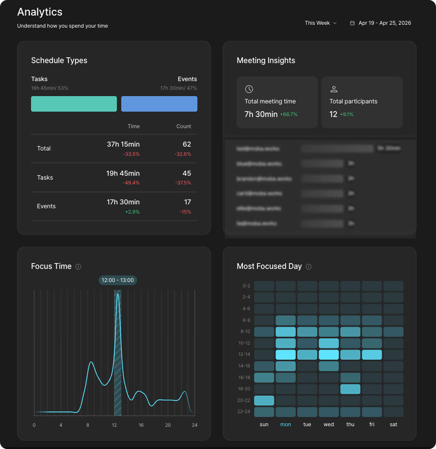 Focus Time 그래프는 하루 중 내가 실제로 집중한 시간대를 곡선으로 보여주고, Most Focused Day 히트맵은 요일별·시간대별로 집중이 가장 잘 됐던 패턴을 색상으로 한눈에 보여주기 때문입니다.
