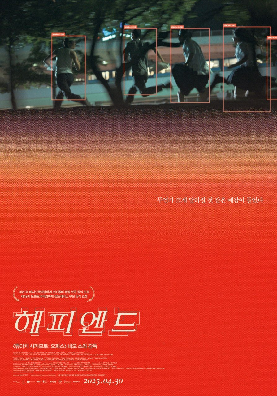 주변에서 좋다고 노래를 부르던 한 영화를 최근에야 봤습니다. 아버지 '류이치 사카모토'를 따라 '소라 네오'보다는 '네오 소라'라고 더 많이 불리는 감독의 <해피엔드>입니다. 곧 다가올 어느 날의 일본을 배경으로 하고 있는 이 영화에서는 학생들이 주인공입니다. '유타', '코우', '아타', '톰', '밍'은 음악으로 모인 5명의 친구들로, 이 날 밤에도 클럽에 몰래 잠입하여 음악을 감상하기로 결심합니다. 하지만, 역시 모든 것은 계획대로 되지 않고 갑자기 나타난 경찰의 단속을 피해 교복자락을 휘날리며 밤거리를 달려나갑니다. 이때 카메라는 질주하는 5명의 청춘의 뒷모습을 비추는데요, 문득 화면이 정지합니다. 레터메일 상단에 있는 포스터가 바로 그 장면인데요. 달리고 있는 아이들의 발을 희미하게 처리함으로써 마치 공중에 떠 있는 것 같은 느낌을 주기도 합니다. 오프닝 시퀀스는 이른바 '프리즈프레임'으로 시작되는데요, 영화에도 그리고 그걸 지켜보는 우리의 마음속에도 멈칫- 균열을 준 이 장면은 이윽고 다시 재개되는 움직임에도 여전히 오묘한 느낌을 줍니다.