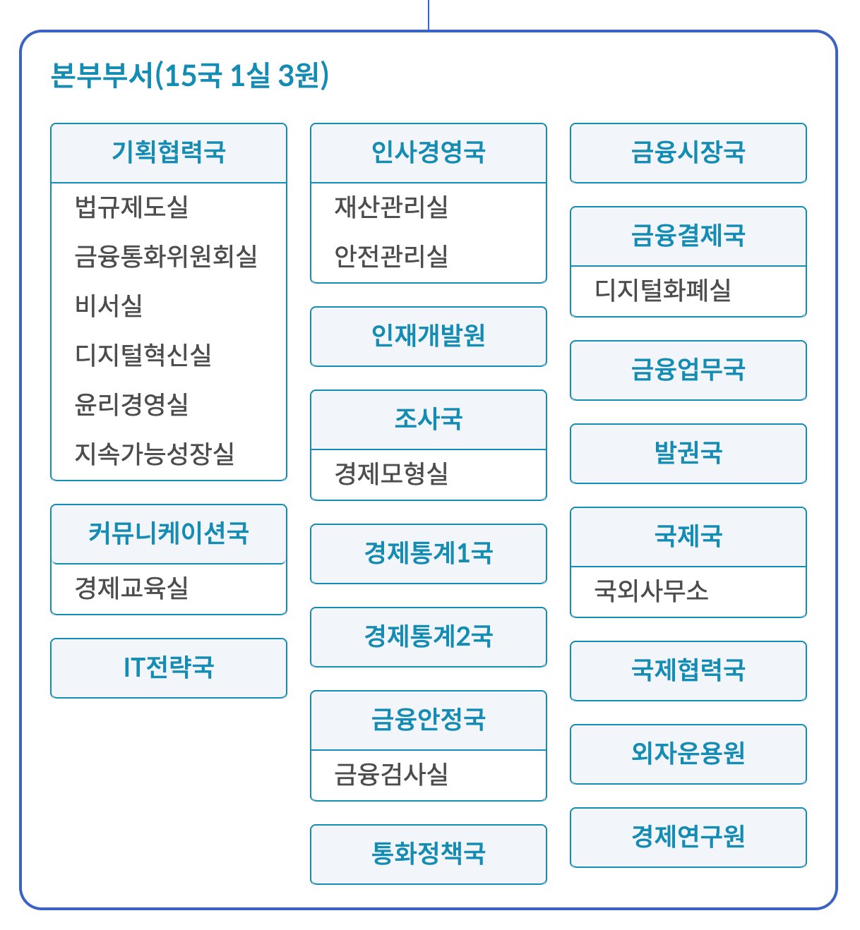 ํ๊ตญ์ํ์ ์กฐ์ง๋๋ฅผ ๋ณด์์~ ์ด์ฌ, ๊ฐ์ฌ ๋ฑ ๋ปํ(?) ๋ถ์๋ค์ ๋นผ๊ณ ๋๋จธ์ง๋ฅผ ๋ณด์๋ฉด ํฌ๊ฒ ๋๋ก ๋๋์ด์. ๋ฐ๋ก ๐ง ๋ณธ๋ถ๋ถ์์ ๐๏ธ ์ง์ญ๋ณธ๋ถ์ฃ . ๋ณธ๋ถ๋ถ์๋ ์์ธ์ ์์นํด ์๊ณ ํ๊ตญ์ํ์ ์ปจํธ๋กค ํ์ ์ญํ ์ ํด์. ๊ธฐ์ค๊ธ๋ฆฌ๋ฅผ ์ฌ๋ฆด์ง ๋ด๋ฆด์ง, ์งํ๋ฅผ ์ผ๋ง๋ ๋ฐํํ ์ง ๋ฑ ์ฐ๋ฆฌ๋๋ผ ๊ฒฝ์ ์ ์ค์ํ ์ผ๋ค์ ๊ฒฐ์ ํ๊ณ GDP ๊ฐ์ ๊ตญ๊ฐ ํต๊ณ๋ ์์ฑํ์ฃ .