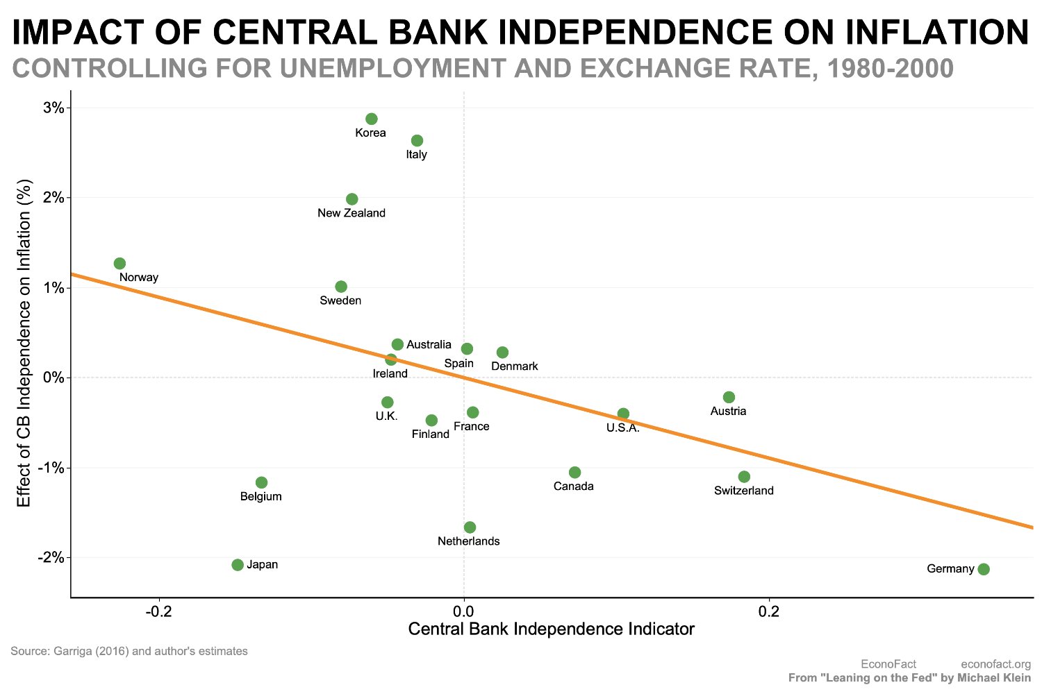 ๋ณดํต์ ๊ตญ๊ฐ๋ค์ ์ค์์ํ์ ๋ ๋ฆฝ์ฑ์ ์ ์ฑํ๊ฒ ์ฌ๊ฒจ์. (ํ์ฌ ๋ฏธ๊ตญ์ ์๋ ๊ฒ ๊ฐ์ง๋ง) ์ ๋ถ๊ฐ ํ๋ฅผ ์ํด ๊ฒฝ๊ธฐ ๋ถ์์ ๊ฐํ๊ฒ ์๋ฐํด๋ ์ค์์ํ์ด ๋ฌผ๊ฐ๋ฅผ ์ก๊ธฐ ์ํด ๊ฑฐ์ ํ ์ ์๋ ์์คํ ์ด ์์ฃผ ๊ฑด๊ฐํ ๊ฒ์ด์ฃ . ์๋ ๊ทธ๋ํ๋ x์ถ(์ค์์ํ์ ๋ ๋ฆฝ์ฑ)-y์ถ(์ธํ๋ ์ด์ )์ ๊ด๊ณ๋ฅผ ๋ณด์ฌ์ฃผ๋๋ฐ์. ์ด๋์? ์ค์์ํ์ด ๋ ๋ฆฝ์ ์ผ์๋ก ์ธํ๋ ์ด์ ์ด ์ ์กํ๋ค๋ ๋๋ฌด ๋น์ฐํ ๊ฒฐ๊ณผ์ฃ ?