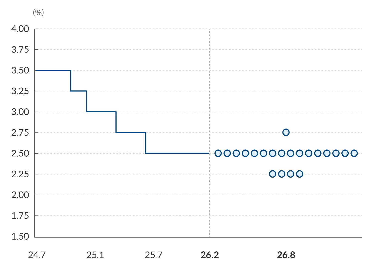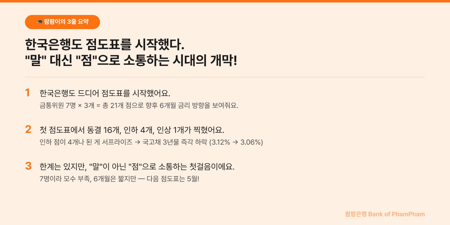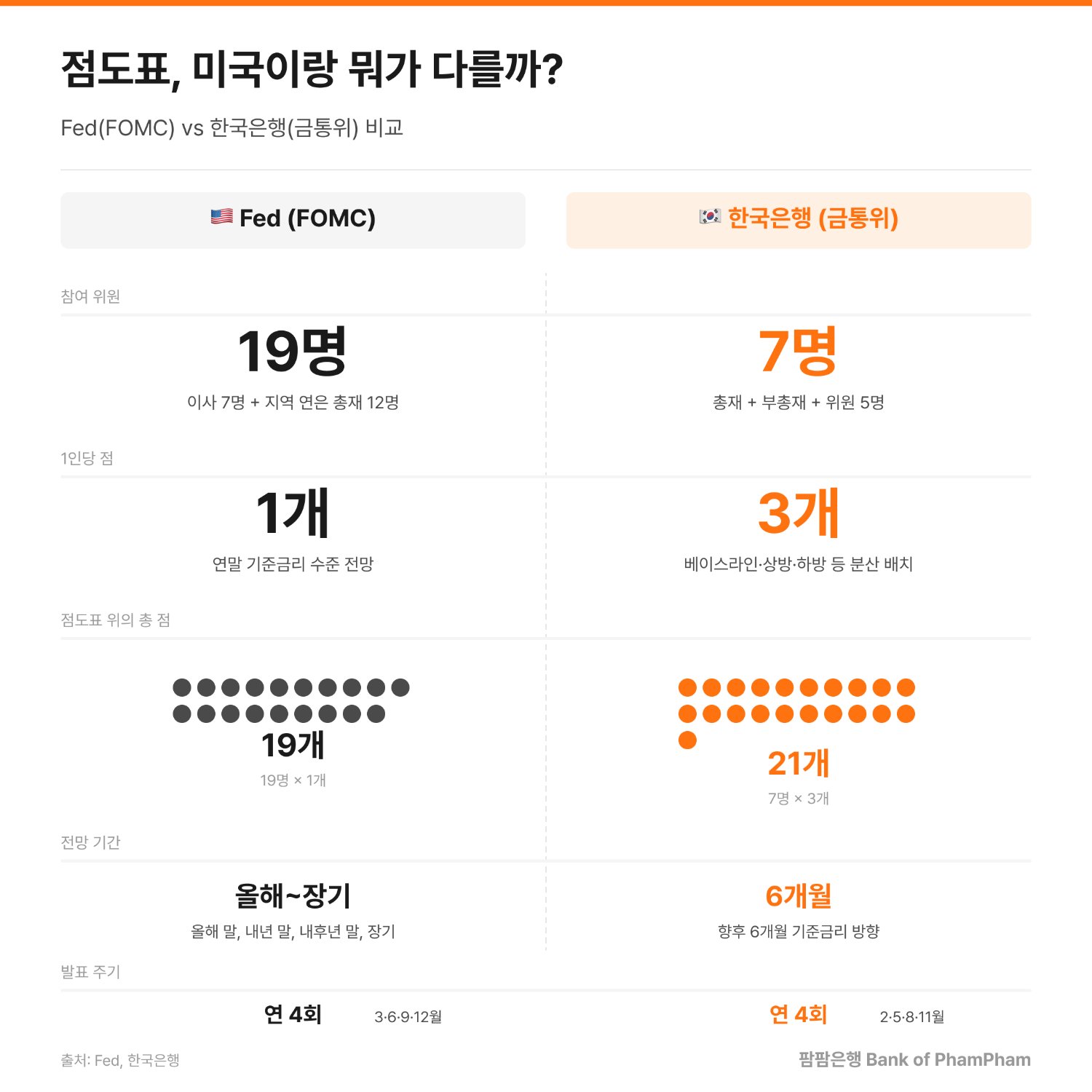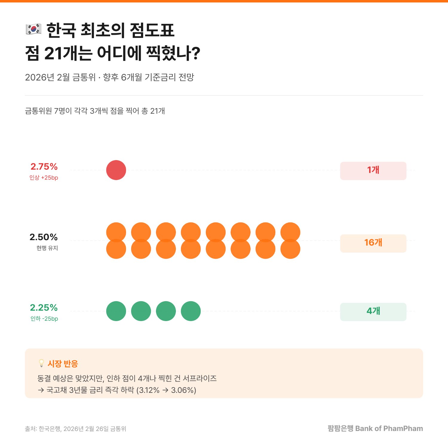 그래서 내부 모의실험과 해외 사례 조사 등을 통해 드디어 2026년 2월 26일부터는 전망 기간을 3개월에서 6개월로 확대했고, 정량적인 지표를 보여주기 위해 금통위원 7명이 각각 3개씩 총 21개의 점을 찍는 방식으로 변경했어요. (연준은 3월, 6월, 9월, 12월에 점도표를 발표하는데 우리나라는 그보다 1개월씩 앞선 2월, 5월, 8월, 11월에 발표한다는 사실이 참 재밌네요.)