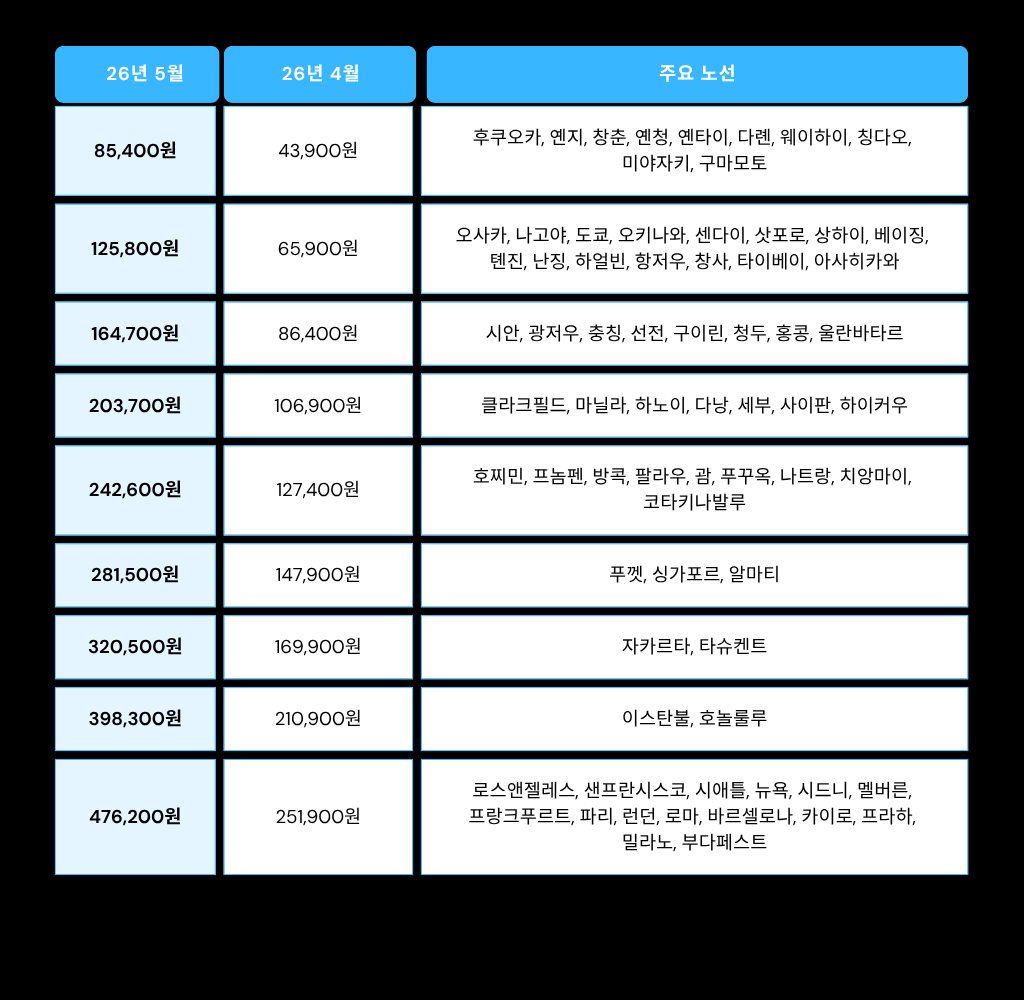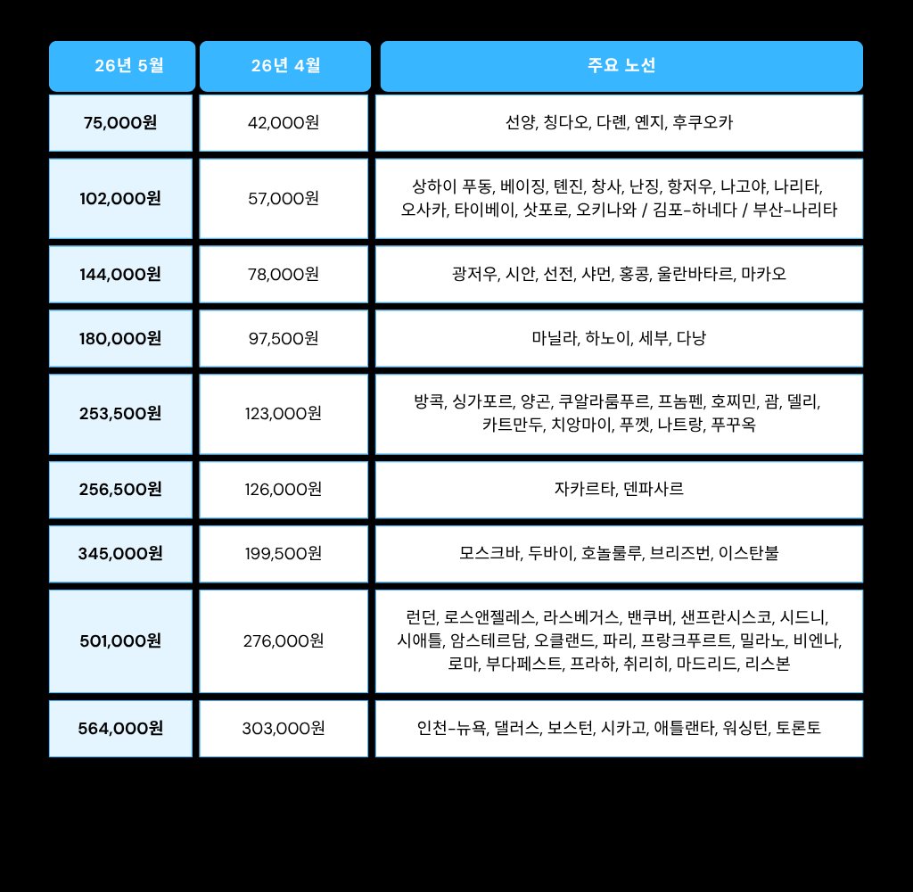 ๋ํํญ๊ณต์ ์ต๋จ๊ฑฐ๋ฆฌ ๋ ธ์ (ํ์ฟ ์ค์นด, ์นญ๋ค์ค ๋ฑ)์ ํธ๋ ๊ธฐ์ค 7๋ง5000์์ ์์์ผ๋ก ์ฅ๊ฑฐ๋ฆฌ ๋ ธ์ (LA, ๋ด์, ํ๋ฆฌ, ๋ฐ๋ ๋ฑ)์๋ ๋ฌด๋ ค 56๋ง4000์์ ๋ถ๊ณผํ ์์ ์ด์ผ. ์ฌํด ์ด 1๋ง3500~9๋ง9000์์ด์๋ ๊ฑธ ์๊ฐํ๋ฉด ๋ ๋ฌ ๋ง์ 5๋ฐฐ ์ด์ ๊ป์ถฉ ๋ด ์ ์ด์ผ. ์์์๋ํญ๊ณต๋ ๋ง์ฐฌ๊ฐ์ง๋ก, ์ด๋ฌ 4๋ง3900~25๋ง1900์์ด๋ ๊ตญ์ ์ ์ ๋ฅํ ์ฆ๋ฃ๊ฐ ๋ค์๋ฌ์ 8๋ง5400~47๋ง6200์์ผ๋ก ์ฌ๋ผ.