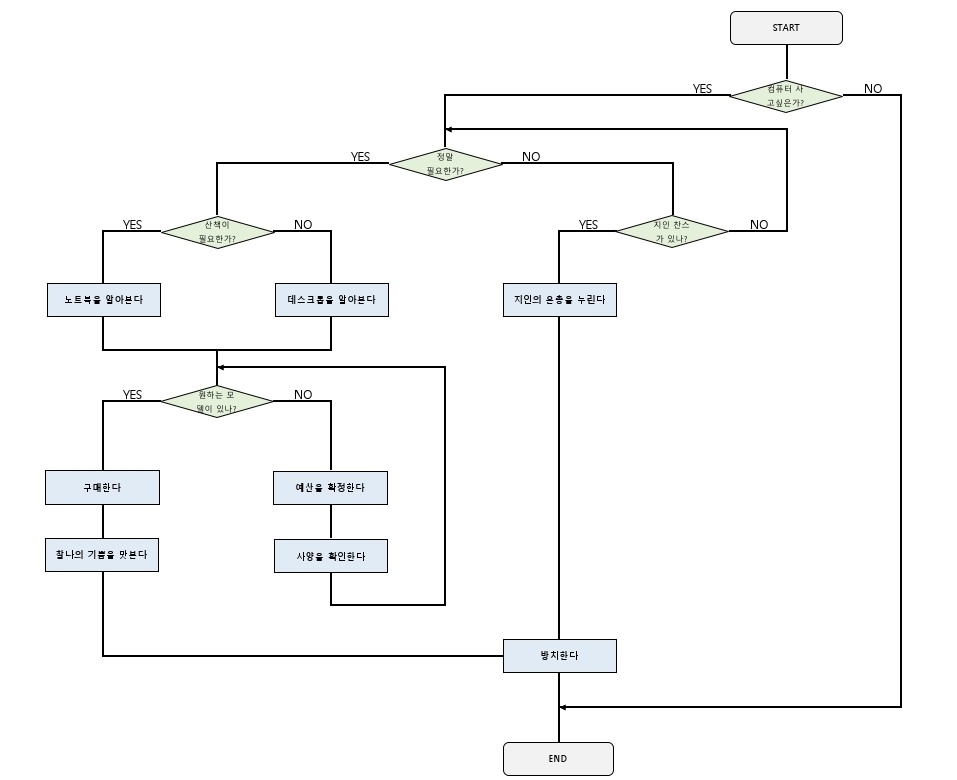 설명하기가 왜 이렇게 어렵지? 하고 컴퓨터 구매 알고리즘을 그려봤습니다.