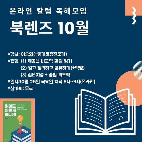 10월, 북렌즈 온라인 독해모임 안내! 함께 칼럼 읽으실분~? 월 1회 정기 온라인 독해모임에 초대합니다! 화면 x, 소리 ×, 비용 × 함께 칼럼 읽고 채팅으로 생각을 나누며 글을 분석하는 시간입니다! 관심 있으신 분은 likeast@naver.com 문의주세요!
