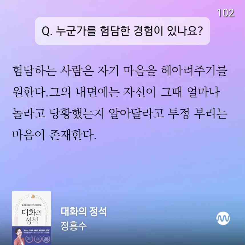 험담을 하고 나면 거의 짜증 같은 부정적인 감정만 오래 담게 되는 것 같아요. 누군가를 험담하는 상황 속에 있을 때 내가 그 사람을 험담하고 미워해도 될 자격이 있는지 스스로에게 물어보면 그렇진 않더라고요. 그래서 험담하는 상황을 피하려고 해요. 사실 어렸을 때 험담에 ...
