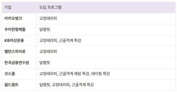 건강한 조직문화는 실천에서 나옵니다. IT·금융업계에서도 구성원들의 건강을 위해 다양한 형태의 근골격계 관리 프로그램을 도입하고 있습니다.