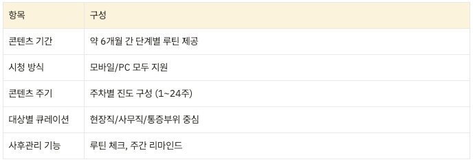 ๋ฌ๋จ์ VOD ์ฝํ ์ธ ๋ ๋จ๋ฐ์ฑ ์์ฒญ์ด ์๋, ์ง์ ๊ฐ๋ฅํ ๋ฃจํด ํ์ฑ๊ณผ ์ค์ฒ ์ถ์ ์ ์ํด ๊ตฌ์ฑํ์ด์. ๋ํ ์คํ๋ผ์ธ ๋ฌ๋จํ ๊ต์ก์ ๋ฐ์ ์กฐ์ง์ ๊ฒฝ์ฐ, ํด๋น ์ปค๋ฆฌํ๋ผ๊ณผ ์ฐ๊ณ๋ ๋ง์ถคํ VOD ์ฝํ ์ธ ๋ฅผ ํตํด ๊ต์ก ํจ๊ณผ๋ฅผ ์ฅ๊ธฐ์ ์ผ๋ก ์ ์งํ ์ ์์ต๋๋ค.