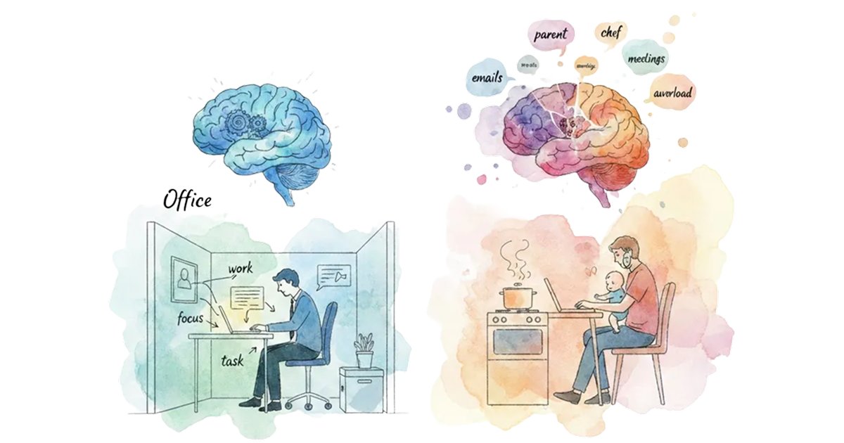 환경 심리학의 경계 이론(Boundary Theory)에 따르면, 인간은 직장인, 부모, 개인 등 각기 다른 역할을 수행하기 위해 심리적 장벽을 세웁니다. 사무실은 오로지 업무만을 위한 자극으로 가득 찬 공간이었기에 이러한 장벽이 물리적으로 보호되며 뇌가 즉각적인 업무 모드로 전환될 수 있었던 것이죠.