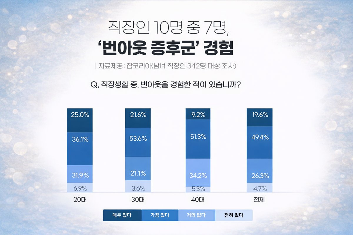 2024 유아이패스(UiPath) 조사를 통해 국내 직장인 약 93%가 직무 과정에서 번아웃을 경험한 것으로 나타났습니다. 잡코리아가 남녀 직장인을 대상으로 조사한 바로는 10명 중 7명이 번아웃을 경험한 적 있다 응답했죠.
