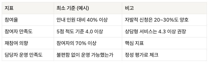 6개월 차: 재참여율과 만족도 변화를 확인합니다. 처음 참여한 직원이 다시 신청하는 비율이 핵심 지표입니다.