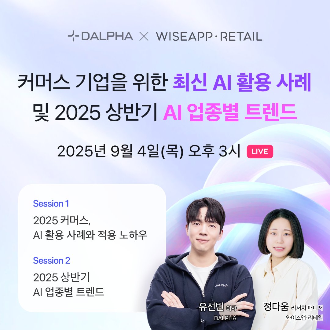 이번 웨비나에서는 AI 스타트업 DALPHA가 와이즈앱·리테일과 함께 국내외 커머스 기업의 AI 혁신 사례와 적용 노하우를 심도 있게 소개합니다. 커머스 기업이 AI를 통해 운영 효율성을 높인 실제 사례를 공유하고, 업종별 AI 앱 사용자 행태를 분석한 자료를 토대로 트렌드를 전망할 예정입니다.