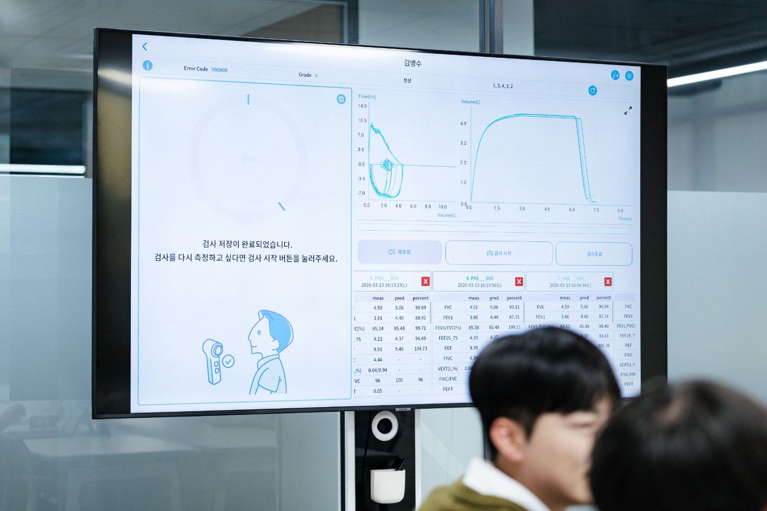 저희 분석 알고리즘은 환자의 호흡 데이터를 자동으로 판단합니다. 국제 폐질환 검사 가이드라인에 알맞게 숨을 내쉬었는지 자동으로 판정하고, 정확하게 내쉰 호흡 데이터만 진단에 활용합니다(예: 중간에 기침하면 다시). 또한 기존 장비는 측정 환경에 따라 결과가 달라지곤 하는데 더 스피로킷은 온도와 습도 등의 변수도 함께 계산하여 표준 장비 대비 0.900 이상의 높은 동시 타당성을 규명했습니다. 이후 수집된 데이터는 클라우드 서버로 즉시 전송되어 정상·폐쇄성·제한성 등의 질환으로 자동 분류하고, 의료진에게는 해당 결과를 바탕으로 최신 지침 기반의 진료 가이드라인을 제공합니다.
