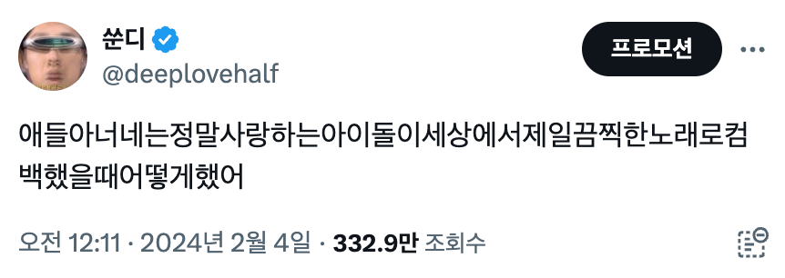 많은 K-POP팬들이 아이돌의 비주얼에 집중하는 것 같지만, 사실 무엇보다 사랑에 쉽게 빠지게 만들고 사랑을 오래 유지시켜주는 것은 바로 그들이 낸 노래입니다. 실제로 별 생각 없이 올렸던 위의 트위터 게시글에 수 많은 사람들이 "탈덕 했습니다."라는 답변을 주셔서 저도 의외였던 기억이 있네요.