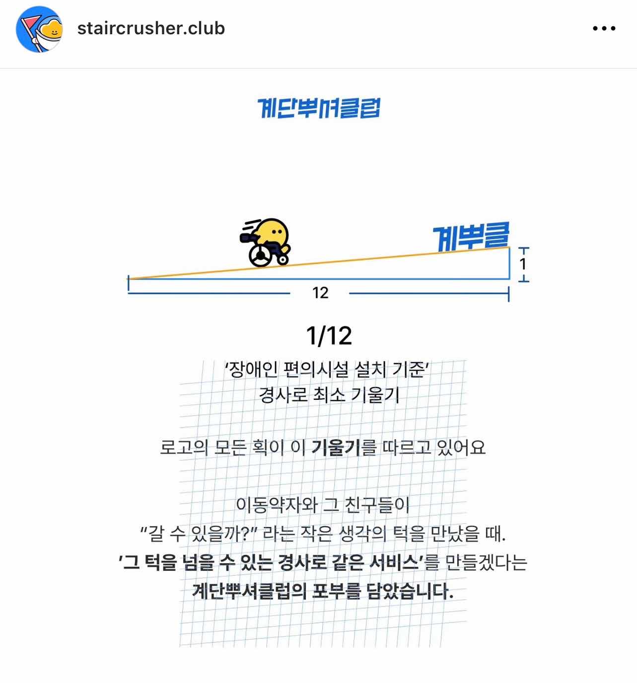 이 로고는 ‘장애인 편의시설 설치기준’경사로 최소 기울기를 반영했대. 세로 1m 일때 가로 12m 길이가 확보되어야 혼자 휠체어를 밀고 올라가기 안전하다는 것! 로고의 모든 획이 이 기울기를 따르고 있고, 이동약자들이 ‘갈 수 있을까?’ 와 같은 작은 생각의 턱을 만났을 때, ‘그 턱을 넘어갈 수 있는 경사로 같은 서비스’를 만들어 나가겠다는 클럽의 포부를 담고자 했다네!
