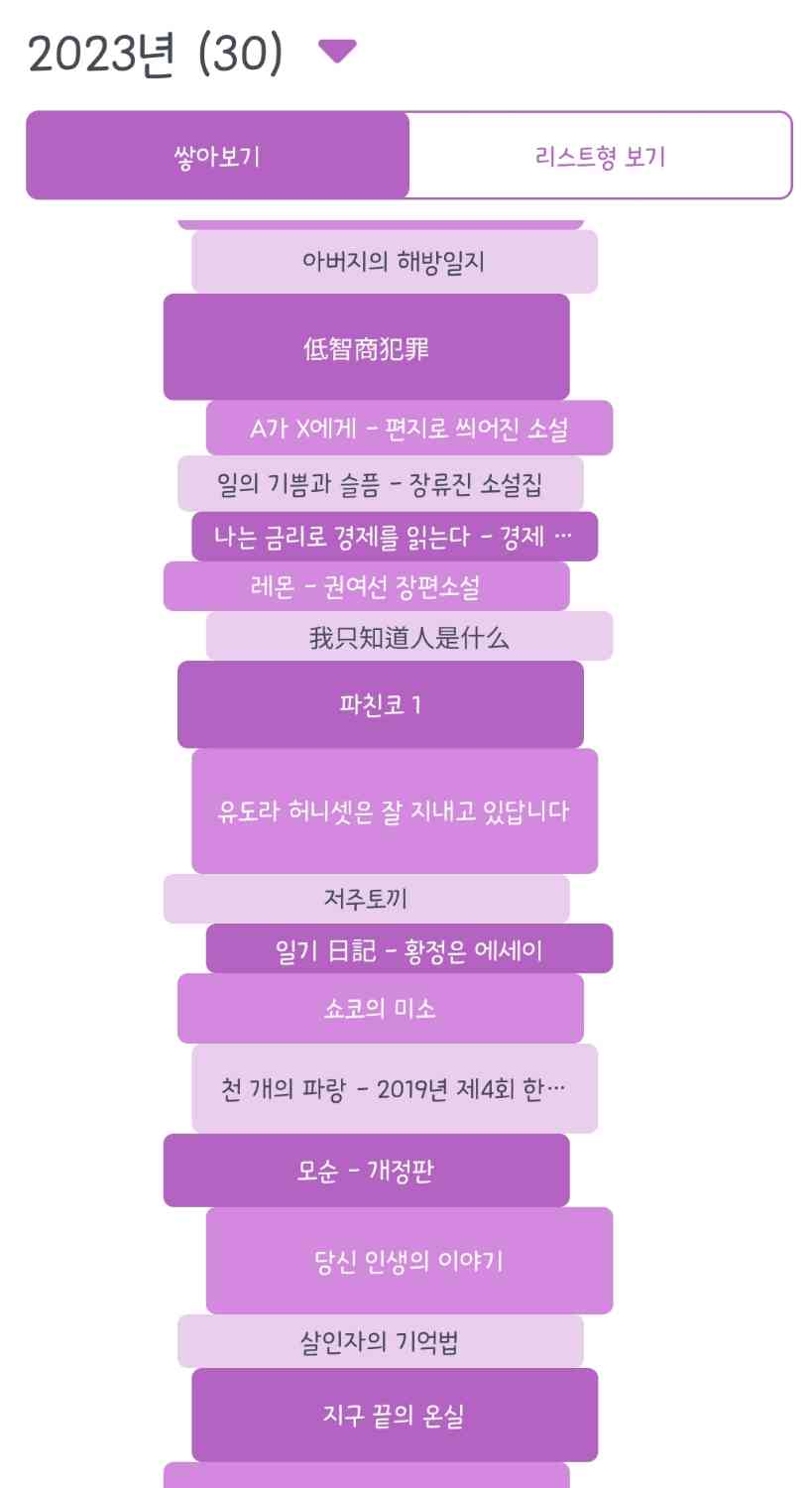 하지만 50권을 채우지는 못했어요. 상반기에 절반을 채워서 가능하겠다 싶었지만, 하반기에 업무가 몰리다 보니 결국 30권에 그치고 말았어요. 사실 바쁘다는 것도 핑계고, 영상 콘텐츠를 보면서 시간을 많이 보냈던 것 같아요. 2024년 새해, 책 50권 읽기를 다시 적어 넣어야겠습니다.