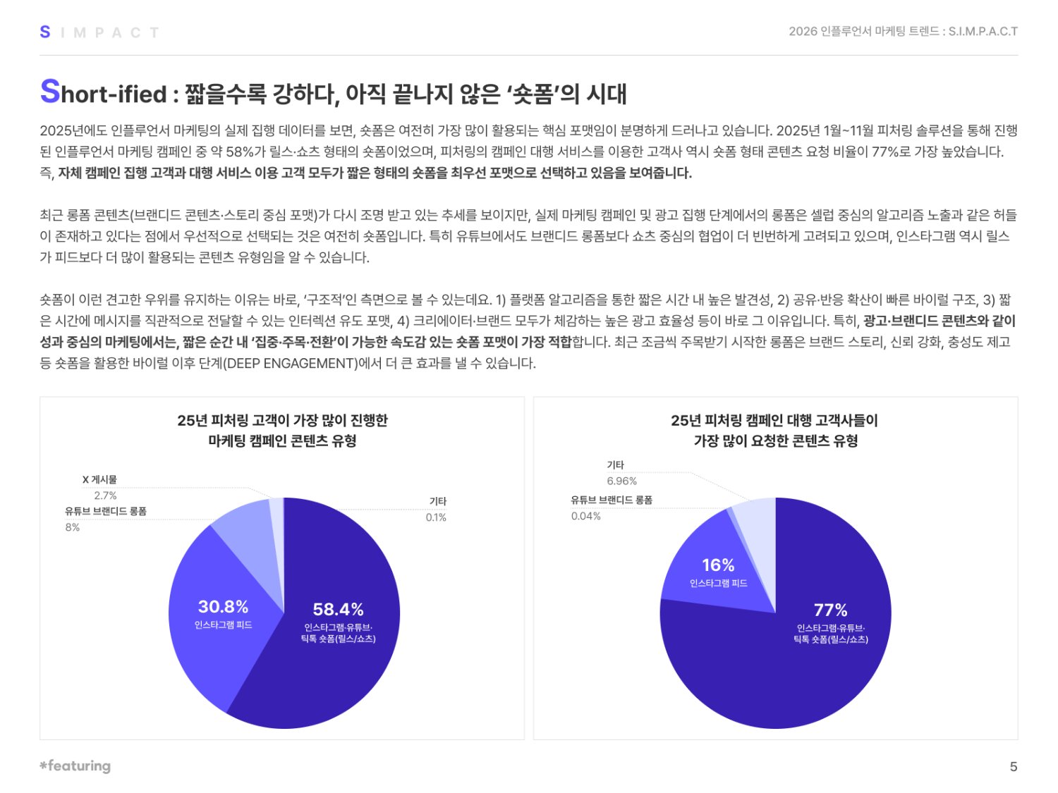 2025년 1~11월 동안 피처링 이용자들이 진행한 캠페인 중 약 58%가 릴스·쇼츠 기반의 숏폼(Shortified Media)이었습니다.