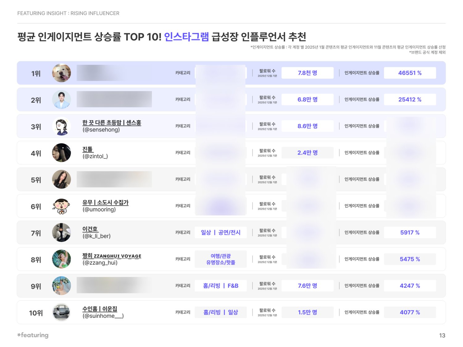 평균 인게이지먼트 상승률 TOP 10! 급성장 인플루언서 추천