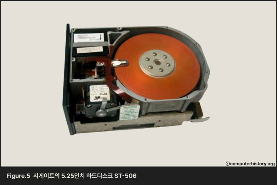 크기와 가격 면에서 진정한 혁신은 1980년에 일어났죠. IBM 출신의 앨런 슈거트Alan Shugart 가 설립한 시게이트 테크놀로지Seagate Technology 가 5.25인치 디스크에 5MB의 용량을 담은 ST-506을 발표한 것이었습니다. 이 제품은 1,500달러(오늘날 가치로 약 500만 원)에 판매되었고, 소형화와 저렴한 가격을 강점으로 내세우며 마이크로컴퓨터 시장을 빠르게 장악했죠. 이를 계기로 HDD의 대중화가 본격적으로 시작되었습니다.