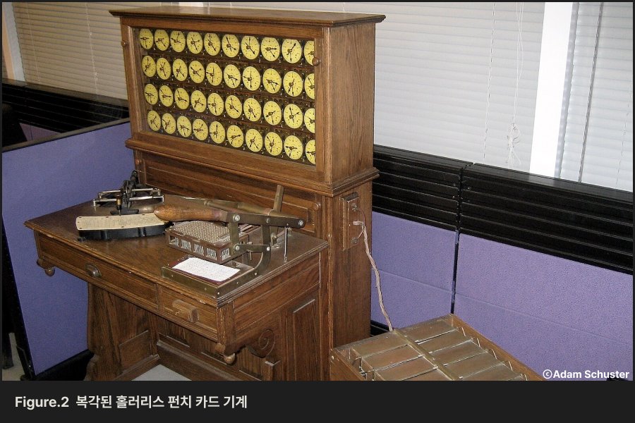 펀치 카드는 이후 1880년대에 다시 주목을 받았죠. 허먼 홀러리스Herman Hollerith 는 천공카드의 구멍을 전기적으로 감지하는 메커니즘을 발명했습니다. 당시 미국 인구 조사국은 10년마다 실시되는 인구 조사 결과를 집계하는 데 거의 10년이 걸리고 있었는데, 이를 해결하기 위해 공모전을 열었고, 그 공모전에서 홀러리스의 아이디어가 채택되었죠. 그의 집계 기계는 1890년 인구 조사에서 사용되어, 단 18개월 만에 집계를 완료했습니다.