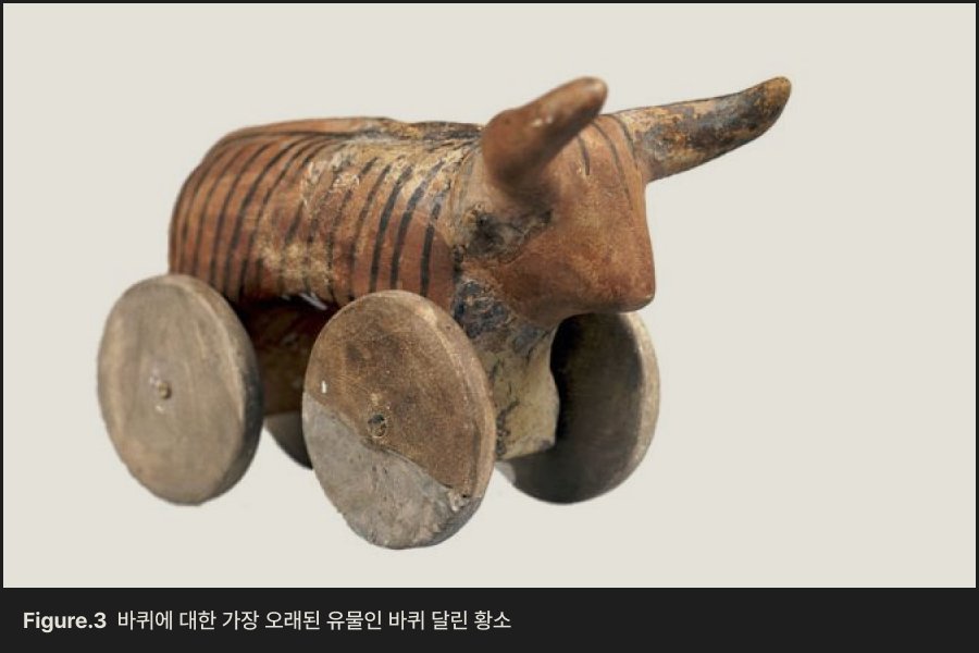 바퀴에 대한 가장 오래된 유물은 기원전 약 4000년 전의 황소 모양 장난감입니다. 그리고 얼마 지나지 않아, 카르파티아 산맥 주변에서 약 150여 점의 사륜차 점토 모형이 출토되죠. 이 유물을 기반으로, 바퀴가 동유럽의 카르파티아 산맥에 있는 구리 광산에서 사용하기 위해 발명되었을 것으로 추측됩니다. 당시 바퀴는 차축 양쪽에 바퀴가 고정된 윤축이었습니다.