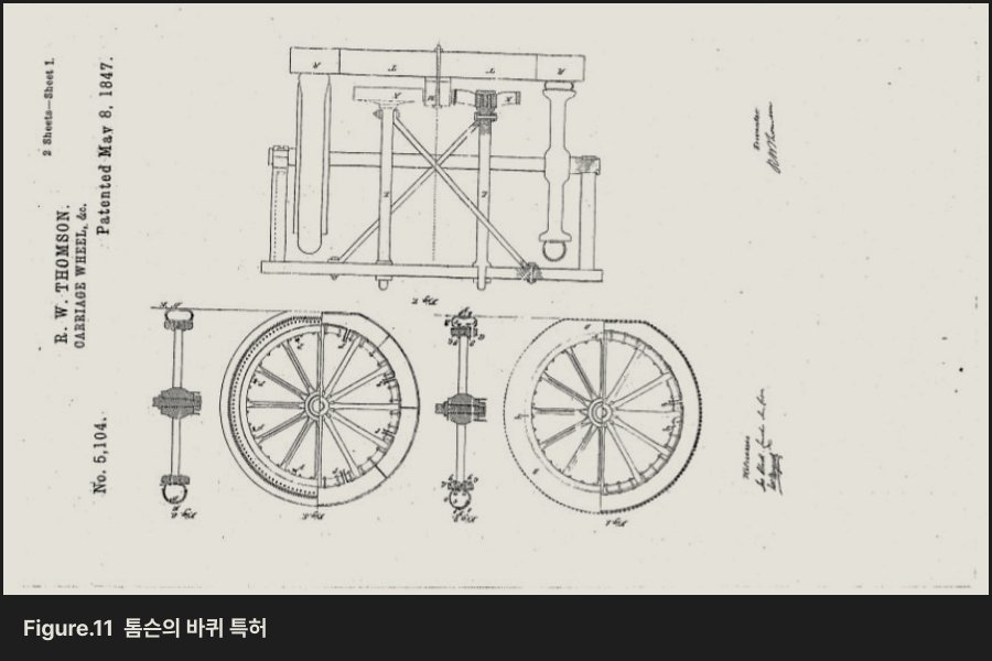공기 타이어가 등장한 것은 1847년 로버트 윌리엄 톰슨Robert William Thomson이 공기 타이어 특허를 받으면서 부터입니다. 하지만 톰슨의 아이디어는 실제 생산으로 이어지지 못했습니다.