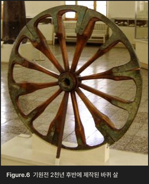기원전 2000년경, 바퀴살이 있는 바퀴가 등장했습니다. 바퀴살의 개발 배경에 대해서는 두 가지 주요 이유가 제시되는데요. 첫 번째는 운반 효율성을 높이기 위해 바퀴를 가볍게 만들려는 노력에서 비롯되었다는 것이고, 두 번째는 바퀴를 제작할 만큼 큰 나무의 공급이 부족해졌기 때문이라는 것입니다. 실제로 흑해 평야에서는 기원전 4000년경부터 숲이 점차 초원으로 바뀌기 시작했고, 기원전 2000년경에는 속이 꽉 찬 바퀴를 만들기에 충분히 큰 나무를 구하는 것이 점점 어려워졌을 것으로 추정되죠.