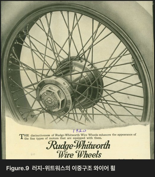 와이어 휠이 자동차에서 본격적으로 사용되기 시작한 것은 20세기 초 존 퓨John Pugh가 설계한 러지-위트워스Rudge-Whitworth의 바퀴가 등장하면서 부터였습니다. 러지위트워스의 바퀴는 이중구조로 되어있었는데요. 내부 행은 접선형 와어어 휠로 되어 회전력에 대한 저항력을, 외부 행은 방사형 와이어 휠로 되어 측면 강도를 확보했죠. 또한, 바퀴를 쉽게 분리 및 교체가 가능하게 만들어 실용성을 높였죠. 이러한 기술 덕분에 와이어 휠은 자동차에서도 점차 보편화되었지만, 1920년대 후반 조셉 샌키Joseph Sankey가 개발한 프레스 강철 휠의 등장으로 점차 그 자리를 내주게 되었습니다.