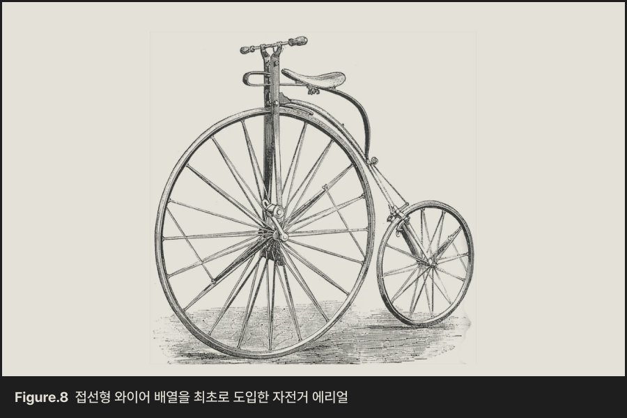 초기 와이어 휠은 기존 나무 바퀴와 동일하게 축에서 바퀴의 림까지 연결되어 있는 방사형이었습니다. 방사형 와이어 휠은 제동과 가속 시 발생하는 회전력에 대한 저항이 약했는데요. 따라서 고속으로 달리는 경우 사용하기 어려웠죠.