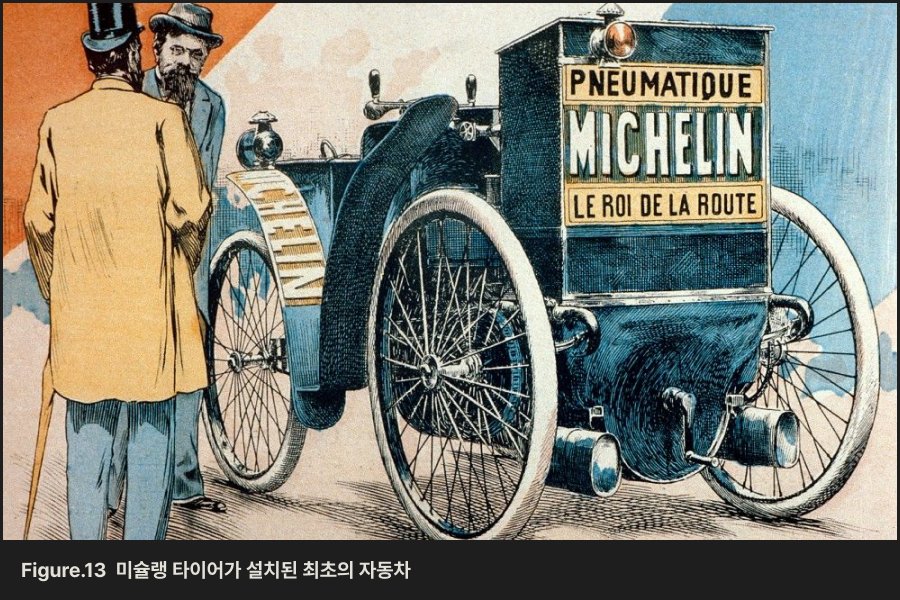 공기 타이어를 최초로 자동차용으로 선보인 사람은 앙드레 미슐랭André Jules Michelin 입니다. 1900년 미슐랭 가이드를 출판한 그 미슐랭 맞습니다. 미슐랭은 1888년 미슐랭 타이어 회사를 설립했는데요. 1889년 지인이 자전거 타이어가 펑크났다며 도움을 요청했는데, 당시 공기 타이어 수리는 복잡한 일이어서 자전거를 고치는데 오랜 시간이 걸렸죠. 이 일을 계기로 미슐랭은 수리를 더 빨리 할 수 있는 방법만 있다면 공기 타이어에 대한 수요가 많을 것이라는 것을 깨닫고, 1891년 분리형 타이어에 대한 특허를 취득합니다.