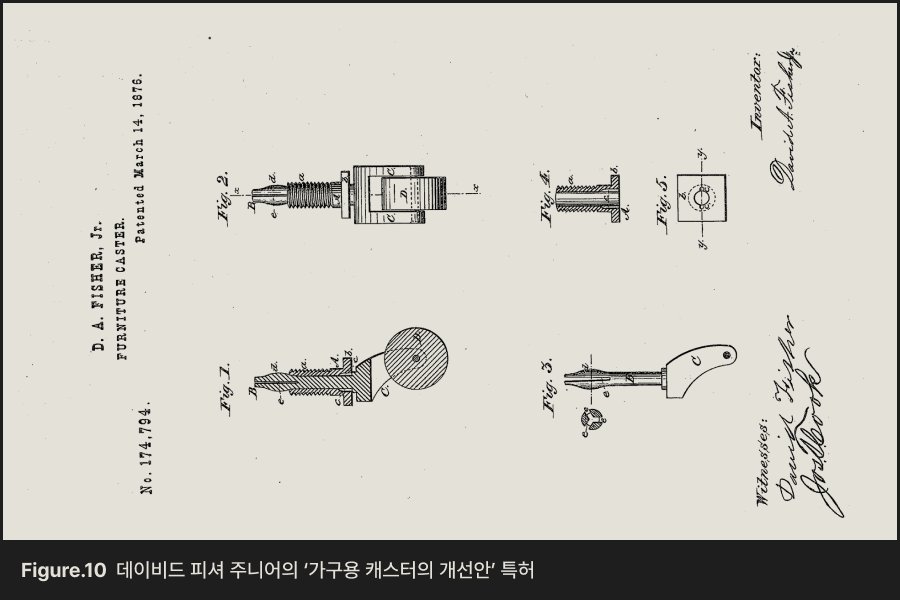 캐스터의 개발자가 누구인지는 알려지지 않았습니다. 가장 오래된 캐스터 관련 문서는 1876년에 작성된 것으로, 데이비드 피셔 주니어David Fisher Jr. 가 특허를 등록한 ‘가구용 캐스터의 개선안’이라는 제목의 증서입니다. 여기서 ‘개선안’이라는 단어를 보면, 이미 당시에도 캐스터는 흔하게 쓰이고 있었음을 알 수 있습니다. 1766년 핀란드의 한 그림에도 휠체어 속에 캐스터가 달려 있는데요. 이로 미뤄보면 캐스터는 적어도 18세기 중반부터 실생활에서 사용되고 있었던 것으로 보입니다.