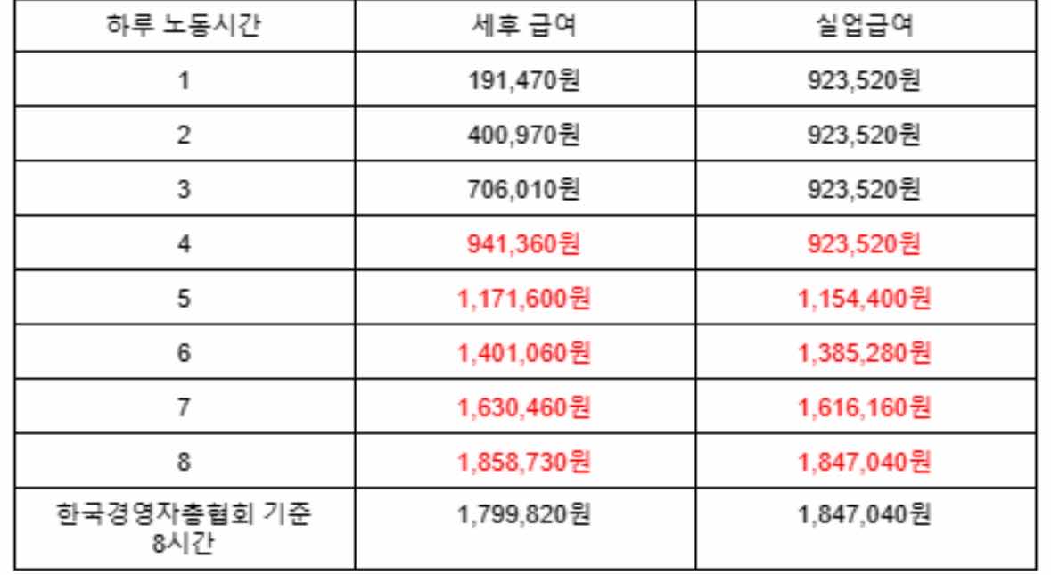 [팩트체크] 한국일보에서 실업급여가 세후 최저임금보다 높다는 보도를 했었어. 사실인지 팩트체크를 해봤어. 주휴수당이 발생하는 경우는 한 달에 4번이라고 가정했어. 하루 1 ~ 3시간 주 5일 한 달 23일 일하는 노동자가 실업급여를 받는 경우, 실업급여는 최저임금(세후)보다 높아. 반면, 하루 4 ~ 8시간 주 5일 한달 23일 일하는 노동자의 실업급여는 최저임금(세후)보다 낮아. 초단시간 최저임금 노동자가 실업급여를 받는 경우 월급(세후)보다 실업급여가 많은 역전현상이 발생해. 왜냐면, 실업급여 산정 방식 때문이야.