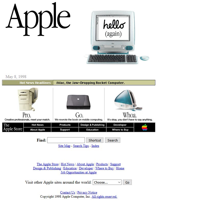 1998๋ ๋์ ์ ํ ์น์ฌ์ดํธ ๋ชจ์ต. ์ถ์ฒ- Web Design Museum