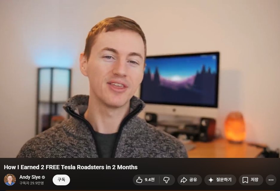 여기서 끝이 아니라, 테슬라는 이 ‘추천하고 싶은 마음’에 제대로 판을 깔았어. 추천 링크로 차량을 구매하면, 추천한 사람에게 보상을 주는 레퍼럴 방식인데, 실제로 “앤디 슬라이”이라는 이름의 유튜버가 이걸로 1,260대 넘게 팔아서 약 640억원의 매출을 올리기도 했어. 이를 계기로 총 7억원 가치의 테슬라 로드스터 차량 2대를 받았다고 해.