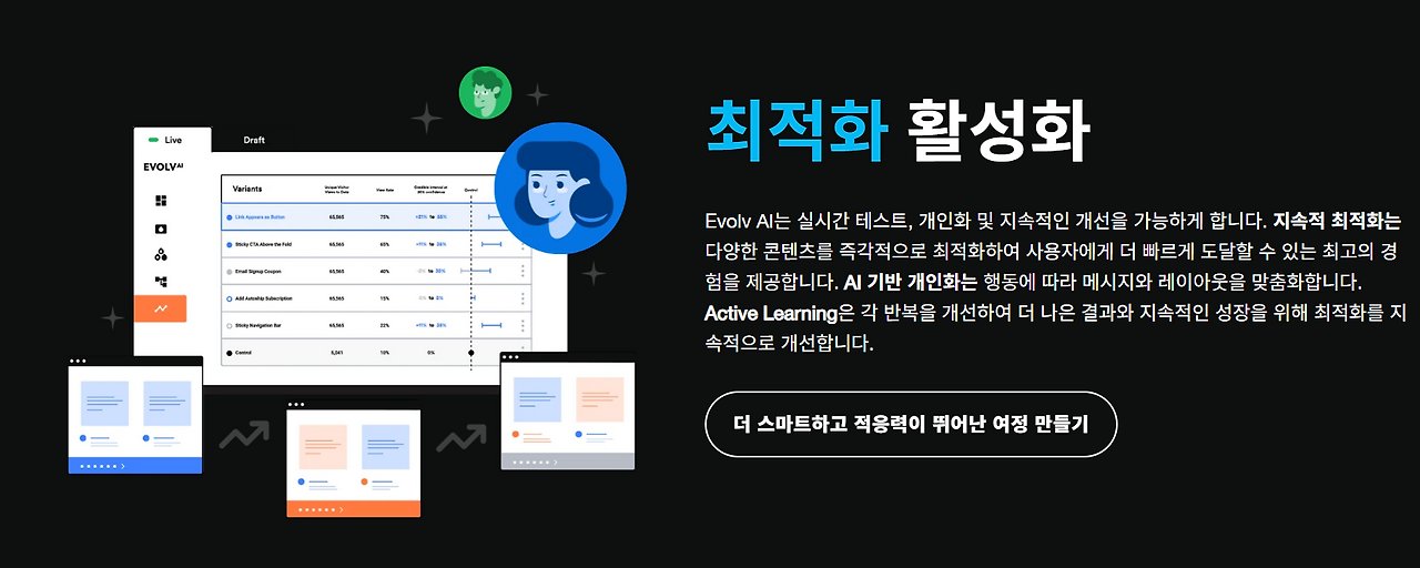이 툴은 머신러닝 기반으로 돌아가는 실험 플랫폼인데요, 여러 가지 조합을 동시에 실험하면서 어떤 게 전환율이 높은지 실시간으로 분석해서 자동으로 최적화해 줘요. 예를 들면 CTA 문구 3개, 배경 색 2개, 이미지 2개 넣으면 그 조합만 해도 여러 가지잖아요? 근데 그걸 하나하나 테스트하지 않아도 AI가 바로 “이게 지금 성과 제일 좋아요!” 하고 알려줘요.