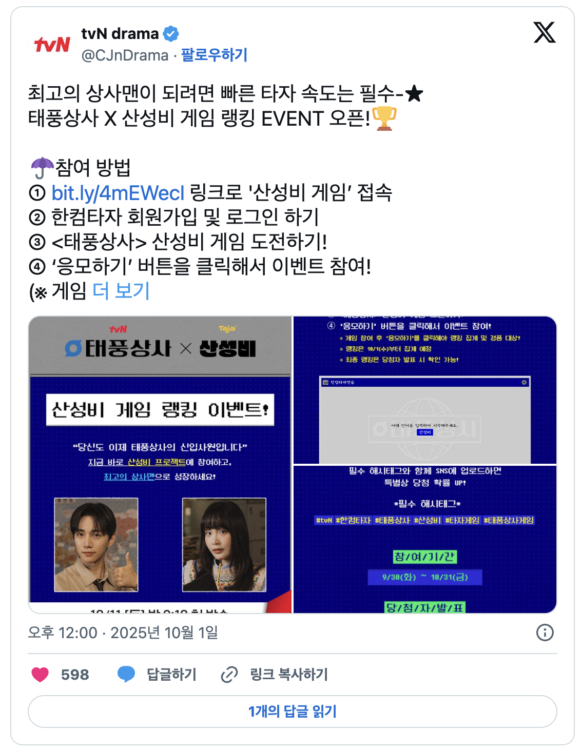 지난번에 아티클로 소개했던 폭군의 셰프 프로모션 처럼 태풍상사도 다양한 이벤트와 캠페인을 진행한 덕분에 2025년 tvN 토일드라마 첫 방송 시청률 1위, 역대 4위를 기록했습니다.