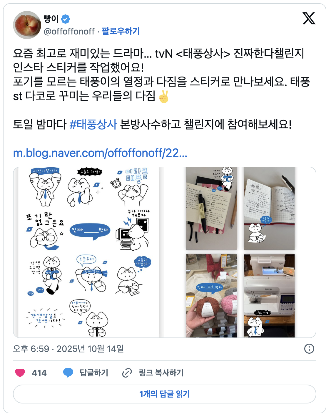 스토리용 스티커는 팔로워 22만 명을 보유한 인기 크리에이터 빵이(@offoffonoff2)가 직접 제작해 더욱 화제를 모았어요.