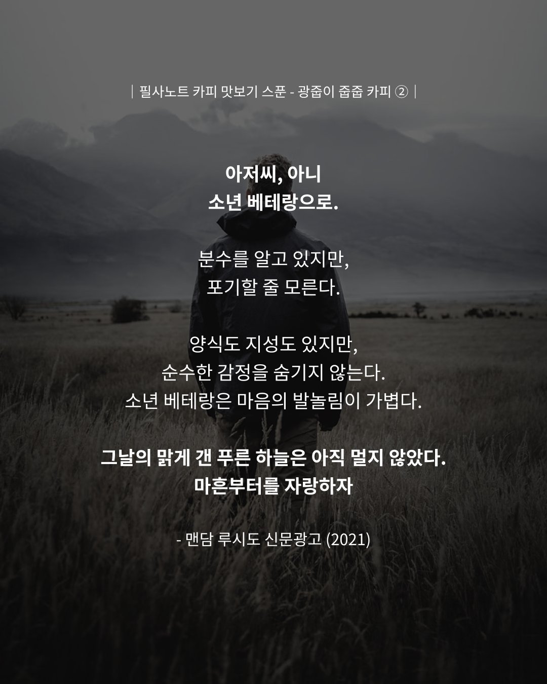 이 카피를 처음 봤을 때, 어두컴컴한 곳에 강렬하게 타오르는 불과 고독하고 비장하게 서있는 누군가의 뒷모습이 떠올랐어요.