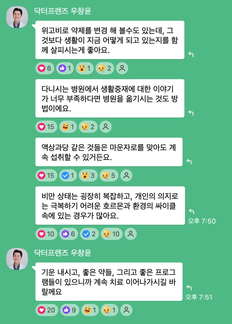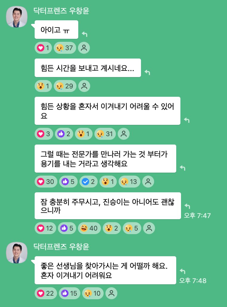 이벤트가 시작되고 쏟아지는 메시지에 참여자들 모두 정상적인 소통이 되겠냐고 우려했지만, 댓글 기능으로 질서가 잡히자 꽤나 깊이있는 고민상담도 가능했습니다.