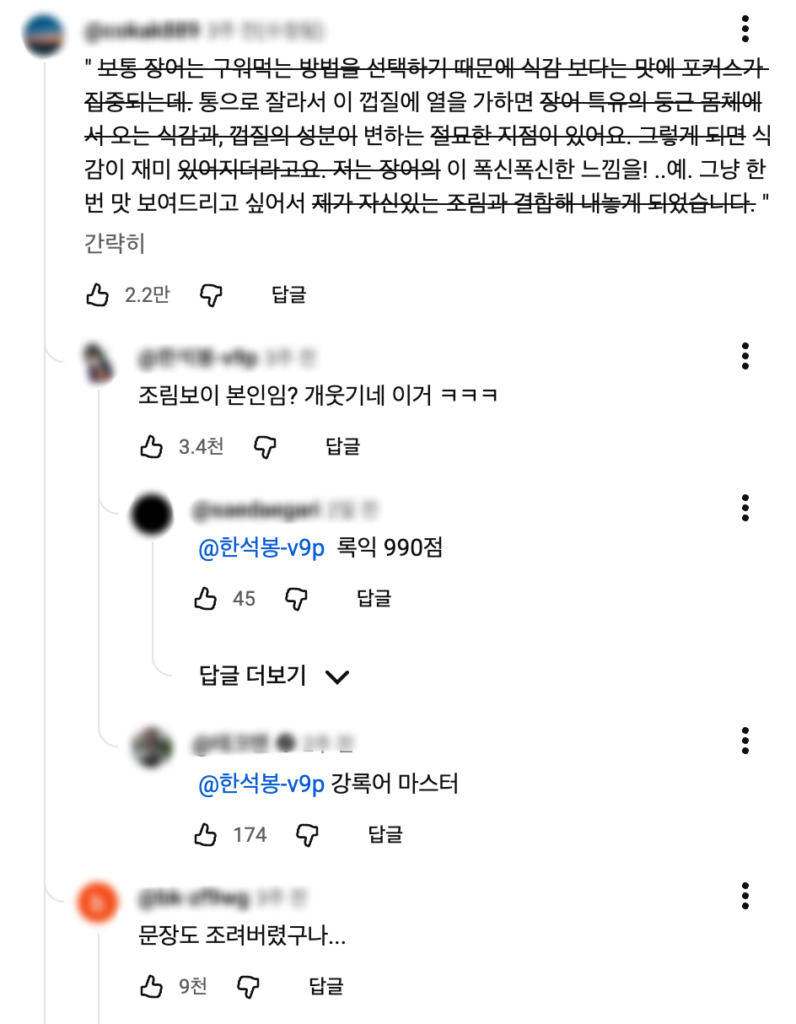 팬 편집 채널(편집자Z , 제프프 등): <흑백요리사>의 긴박한 서바이벌 장면을 아예 기묘하게 편집해 최강록 셰프를 코미디 장르의 주인공으로 재탄생시켰습니다.