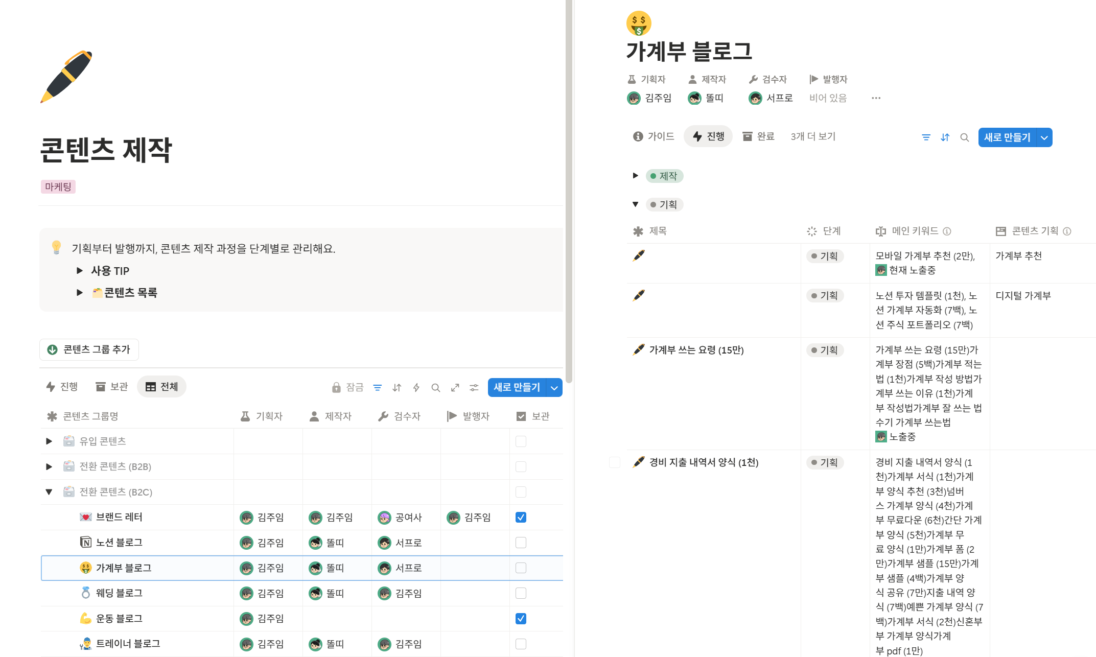콘텐츠 마케터나 에디터, 디자이너는 보통 일을 맡긴 쪽이 정해준 순서에 따라 움직여요. 소재 선정, 키워드 설정, 발행 절차 — 이 흐름이 어디에도 정리돼 있지 않으면, 사람이 바뀔 때마다 처음부터 다시 채워야 하는 구조가 돼요. 결국 일을 맡기면서도 정작 챙겨야 할 일은 줄지 않는 상태가 반복돼요.